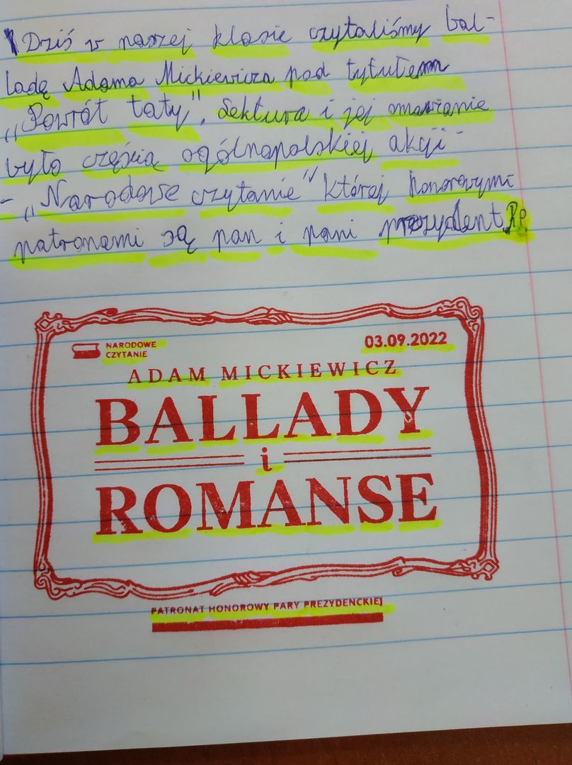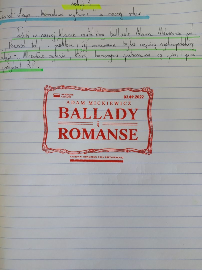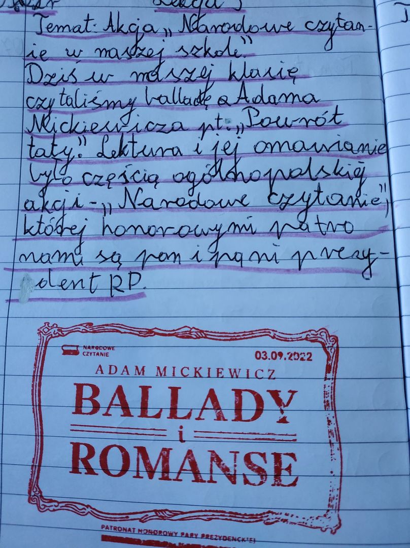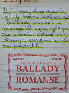 3  września 2022 r. był dniem ogólnopolskiej akcji " Narodowe czytanie", której inicjatorami oraz honorowymi patronami jest para prezydencka - Andrzej Duda i Agata Kornhauser- Duda.