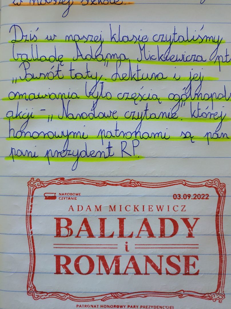 Podobnie jak w latach poprzednich nasza szkoła również wzięła udział w wydarzeniu. W bieżącym roku szkolnym uczniowie klas IV- VIII czytali oraz omawiali ballady Adama Mickiewicza: " Powrót taty" i "Świtezianka".