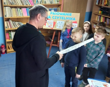 Pasowanie na czytelnika to oficjalne przyj臋cie uczniów klasy pierwszej do grona czytelników biblioteki szkolnej. W naszej szkole odby艂o si臋 ono 21 lutego 2023r. G艂ównym celem uroczysto艣ci by艂o zach臋cenie najm艂odszych uczniów do korzystania z biblioteki szkolnej, wypo偶yczania ksi膮偶ek oraz nieustannego rozwijania umiej臋tno艣ci czytania. Uczniowie z uwag膮 s艂uchali o korzy艣ciach p艂yn膮cych z czytania. Wys艂uchali równie偶 pró艣b, jakie maj膮 do nich ksi膮偶ki.