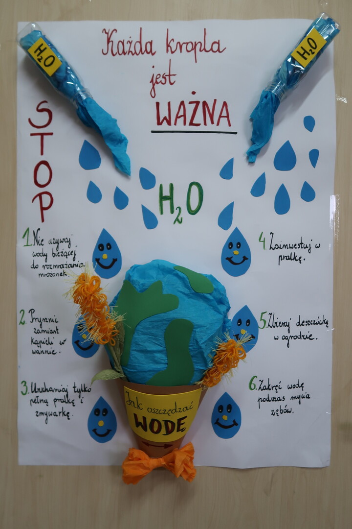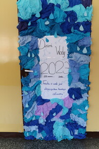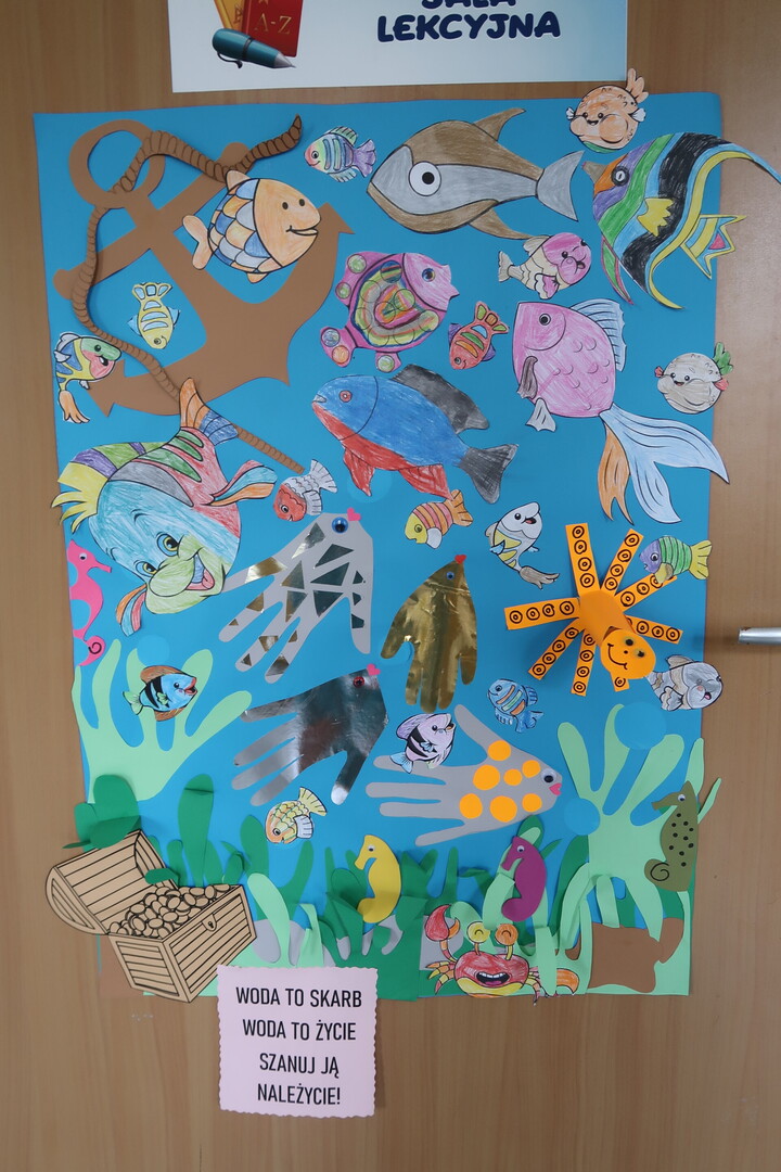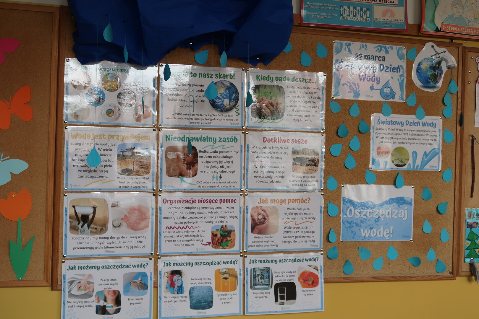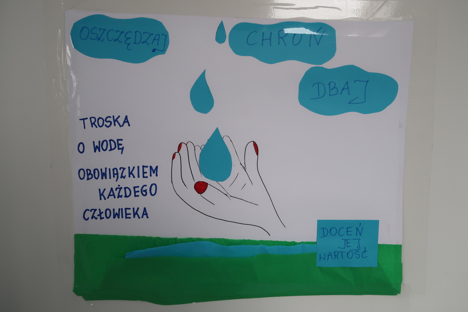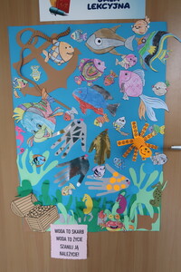 Plakaty na temat wody przygotowane przez każdą z klas pięknie zdobią i informują