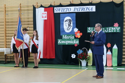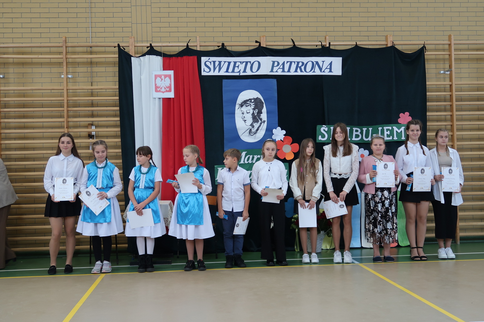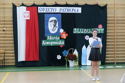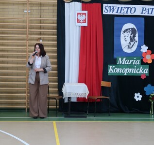 Kolejnym punktem programu była inscenizacja, przygotowana przez uczniów klasy piątej pod kierunkiem pani Wioletty Sobczak, która przybliżyła wszystkim zebranym życie i twórczość patronki naszej szkoły – Marii Konopnickiej.