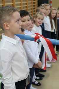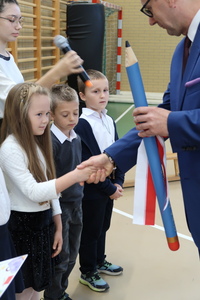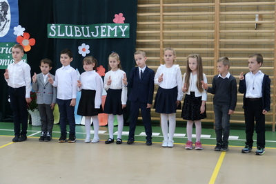 który zarówno pierwszoklasistom, jak i pozostałym uczniom oraz nauczycielom życzył, by czas spędzony w szkole zawsze przynosił radość i spełnienie. Na początku „ Pierwszaki ” pod czujnym okiem wychowawcy – pani Bogumiły Olek, we fleszach przejętych rodziców, śpiewnie i tanecznie „tropiły” Wiedzę. Następnie złożyły uroczyste przyrzeczenie, godnego reprezentowania swojej szkoły.