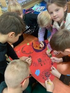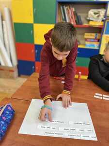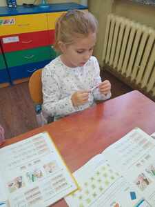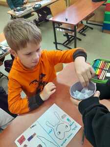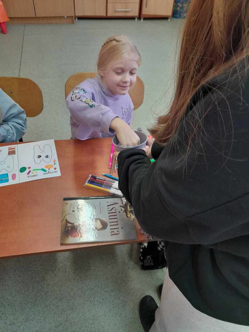 Dzieci z klas I-III przygotowały przepiękne życzenia dla biblioteki. Ponadto uczniowie klas I – II układali baśniowe puzzle, rozwiązywali zagadki, a ich koledzy z klasy III układali tytuły z rozsypanki wyrazowej i rysowali swoją ulubioną postać z bajki.