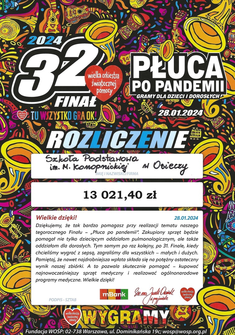 Szkoła Podstawowa im. Marii Konopnickiej w Osieczy zebrała 13 021,40 zł.