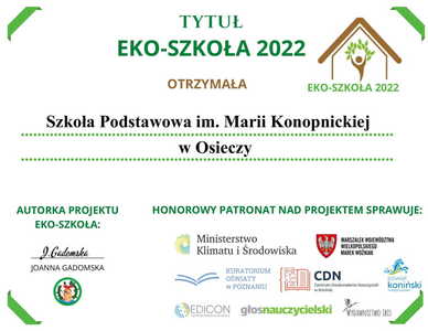 Tytuł EKO SZKOŁA 2022 jest Nasz !!! Przez cały miniony rok szkolny społeczność naszej szkoły wytrwale i ciężko pracowała realizując zadania projektu EKO SZKOŁA 2022 wraz z Promotorem Ekologii- p. Martą Babiak. I stało się Znaleźliśmy się w zacnym gr