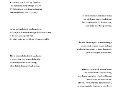 Konkurs na wiersz pt. "Tydzień Tematyczny" Miniony tydzień (12-16 grudnia) minął w Naszej Szkole bardzo intensywnie. SU ogłosił tydzień tematyczny, gdzie każdego dnia ubieraliśmy wyznaczone rzeczy: