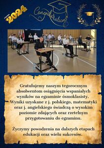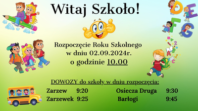 Uroczyste rozpoczęcie roku szkolnego 2023/24 odbędzie się 4 września 2024 r. o godz. 9.00 (sala gimnastyczna). Wszystkim uczniom z okazji rozpoczęcia roku szkolnego życzymy, aby każdy wierzył w Siebie, odkrywał Swoje pasje, rozwijał talenty.